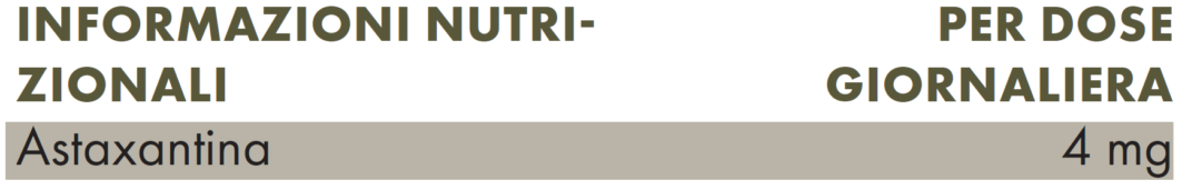 della capsula: idrossipropilmetilcelluloe, oleoresina ricca di astaxantina dall’alga Haematococcus pluvialis.