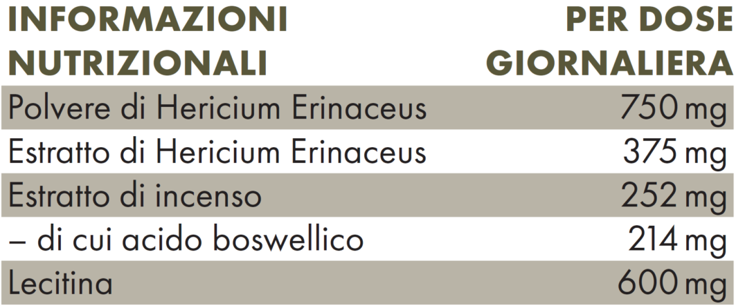 Polvere di hericium erinaceus, lecitina (colza), estratto di hericium erinaceus, agente di rivestimento: idrossipropilmetilcellulosa (HPMC), estratto di incenso.