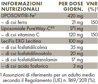 Ferro bisglicinato liposomiale (LIPOSOVIT®-Fe), vitamina C (PureWay-C® liposomiale), agente di rivestimento:idrossipropilmetilcellulosa (HPMC); complesso fosfolipidico in polvere LeciFis EXG.