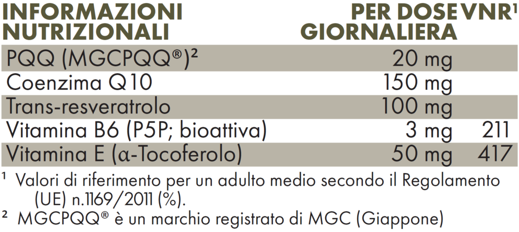 La PQQ (pirrolochinolina chinone) si trova nei mitocondri e contribuisce in modo significativo alla produzione di energia. Grazie all’efficace combinazione con un’alta percentuale di Q10, resveratrolo, vitamina E vitamina B6 bioattiva protegge le cellule dallo stress ossidativo.