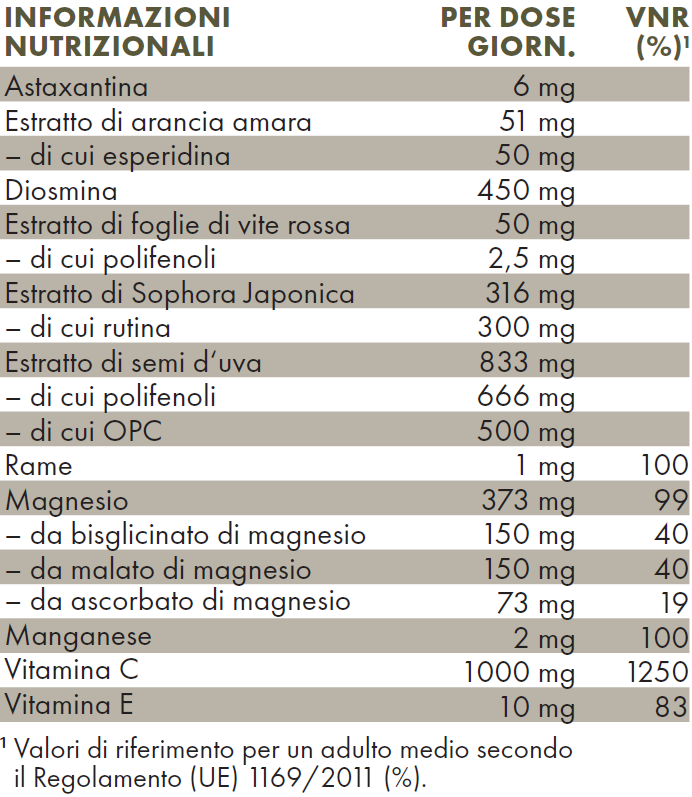 magnesio, agente di rivestimento: idrossipropilmetilcellulosa (HPMC); estratto di semi d‘uva francese, malato di magnesio, diosmina (Citrus L.), estratto di Sophora Japonica, oleoresina ricca di astaxantina dall‘alga Haematococcus pluvialis, estratto