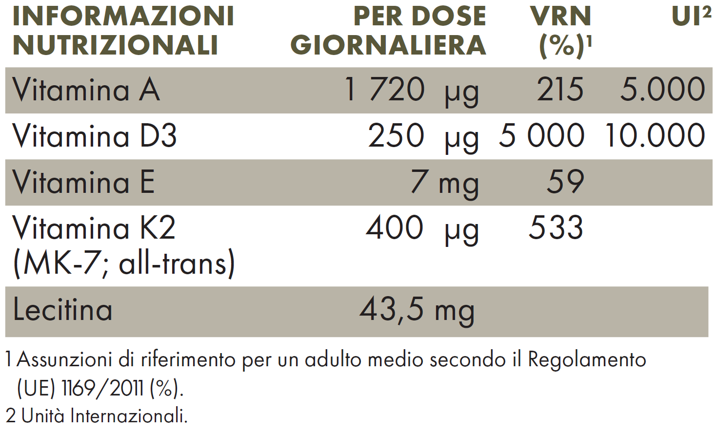 • Contiene le vitamine liposolubili E, K2 (MK7, all-trans) e A