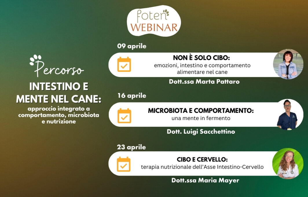 Un ciclo di tre webinar dedicato all’esplorazione dell’Asse Intestino-Cervello nel cane, per comprendere come emozioni, comportamento alimentare, microbiota e nutrizione siano profondamente interconnessi. Un percorso che integra basi scientifiche e applicazioni cliniche, offrendo strumenti pratici per la valutazione e la gestione del benessere psicofisico del paziente in un’ottica realmente sistemica.